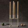 The Kubus 4 Candle Holder is made of steel. There are four slots for candles; there are two in the middle and one on either side. They are mounted on a cube-shaped base that is also made of steel. It is made up of straight bars which counter the rounded shape of the candle holders.
