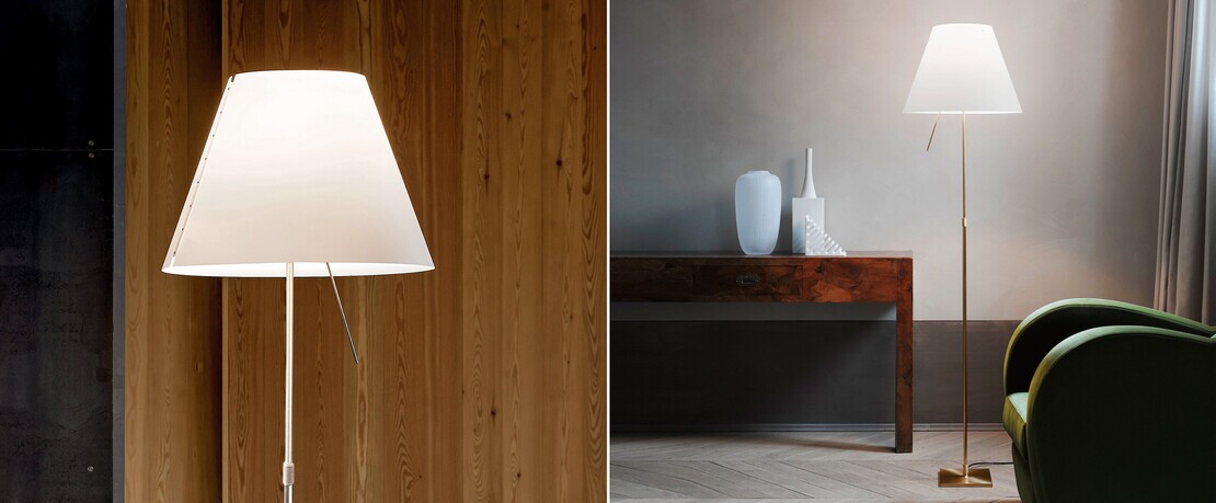... und dennoch hat der erfolgreiche Designklassiker von Luceplan bis zum heutigen Tag nichts von seinem faszinierenden Charme verloren – vielmehr gilt er unangefochten als beliebte Beleuchtungslösung für moderne und klassische Einrichtungsstile. Ihr besonderes Merkmal ist dabei der abwaschbare Schirm, der an nur zwei Punkten aufgehängt ist und sich nach kleinen Bewegungen selbstständig einpendelt. Struktur und Schirm der Stehlampe Luceplan Costanza Terra Teleskop sind in elf verschiedenen Ausführungen, zum Beispiel in Seegrün oder Nebelweiß verfügbar.